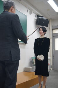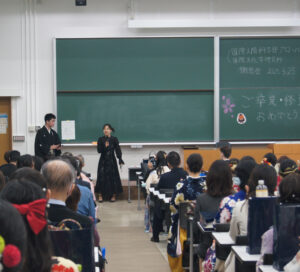 その後、学生2名による司会進行で国際人間科学部グローバル文化学科共催の祝賀会が行われ、学部長・研究科長の祝辞、優秀卒論表彰、日本語教師養成サブコース修了認定証授与と内容盛りだくさん。
