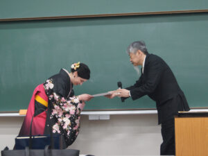 博士後期課程修了生には梅屋研究科長から一人ひとり学位記が手渡されました。