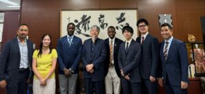 一行は、松﨑真里社長、稲葉皓信副社長、Nate Hasegawa氏、Kalema Martin CTOとエンジニアのKevin Mugarura氏ら。研究科側は、梅屋潔研究科長のほか、グローバル文化学科の中川真理子さんが出席してキャンパスを案内しました(村尾元専攻長、博士後期課程の眞明夏三さんものちに合流)。