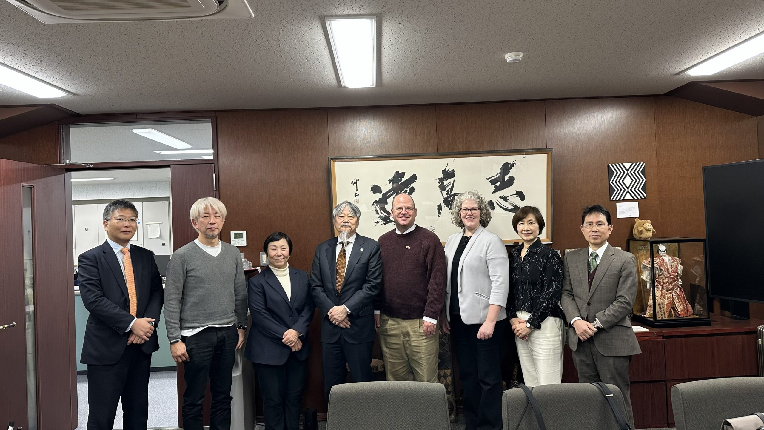 2026年1月6日、テネシー大学ノックスビル校から、たびたび訪問いただいているNoriko J Horiguchi准教授の案内で、国際教育連携担当副学長補佐のWill Jenningsさんと、海外留学プログラムディレクターのKate Scottさんが研究科長室を訪問しました。8日の教職員向けの講演・懇談会他さまざまなプログラムが組まれているようです。Willさんは研究科長室のウガンダ国旗を目ざとくみつけ「ウガンダに行ったことがあるの?」と一言、グローバルサウスの政治学を専門としているWillさんは南スーダンやウガンダにも滞在経験があり、ケープタウンやステレンボッシュにも所属していたとかで、ケープタウン大学客員教授だった梅屋研究科長と別れ際に急に共通の話題が見つかったようでした。「次はテネシーで会いましょう」と再会を約束していました