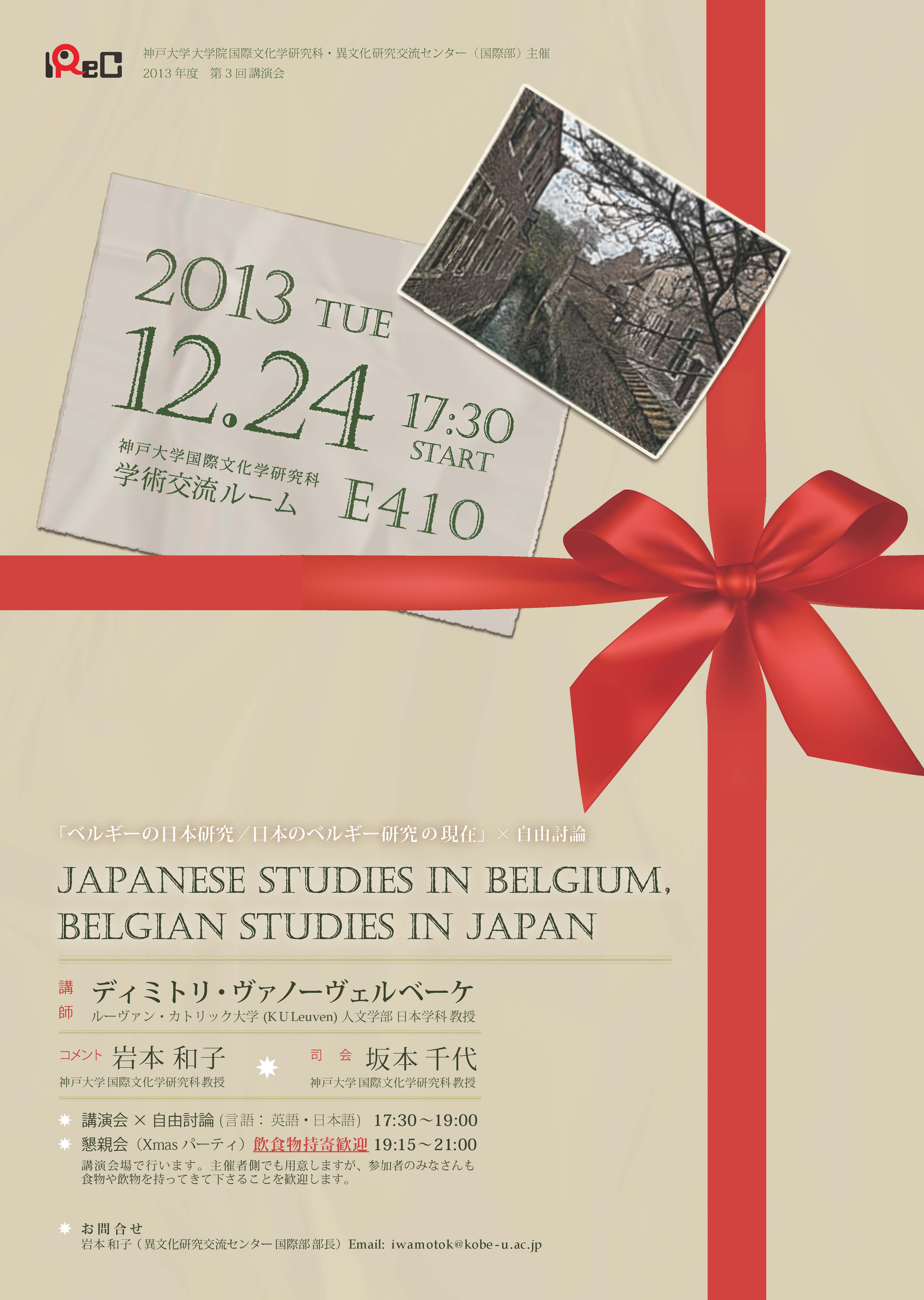 神戸大学大学院国際文化学研究科異文化研究交流センター(国際部)主催、2013年度第3回講演会 "Japanese Studies in Belgium, Belgian Studies in Japan"「ベルギーの日本研究/日本のベルギー研究 の現在」×自由討論 を以下の通り開催いたします。ふるってご参加ください。