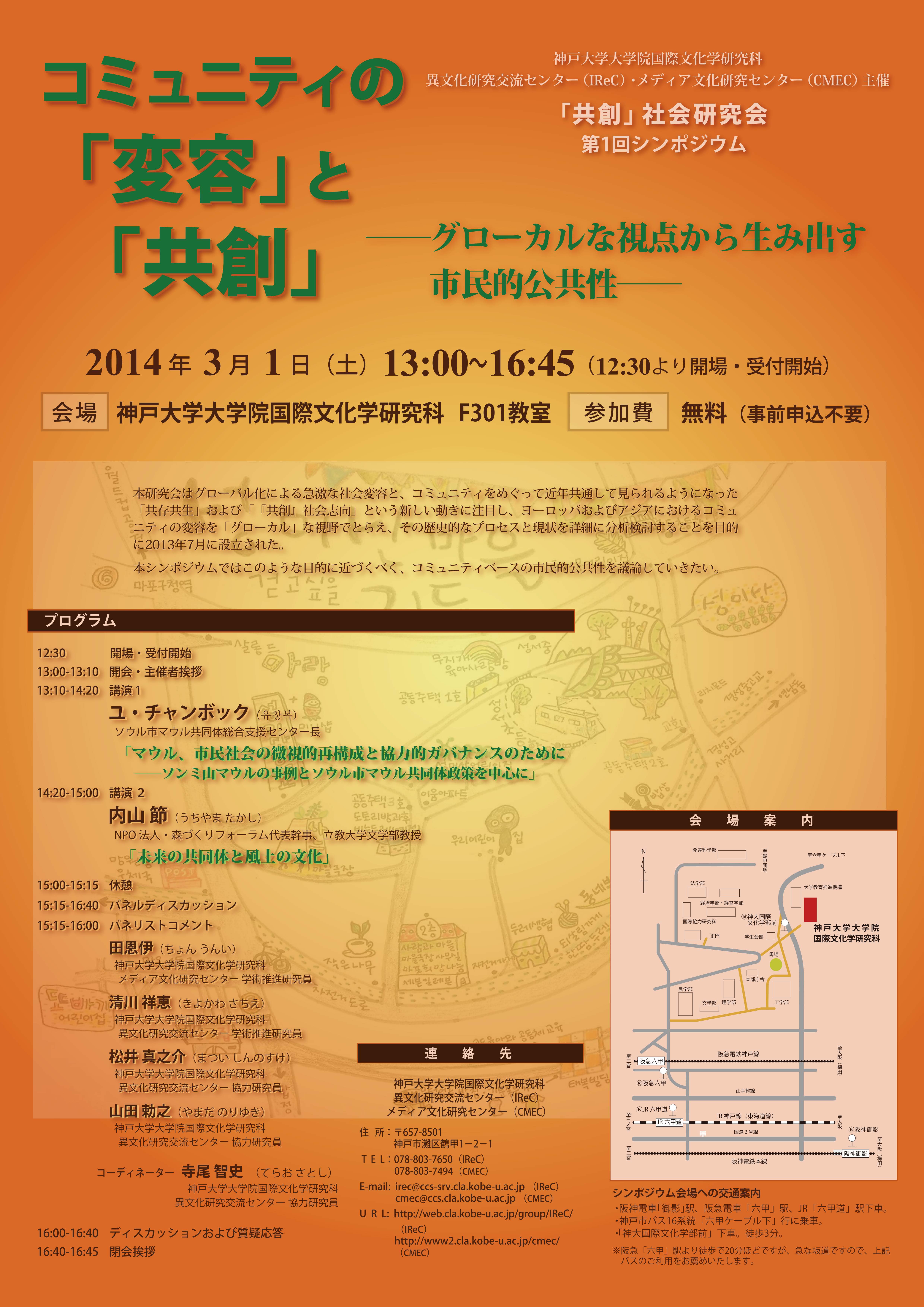神戸大学大学院国際文化学研究科 異文化研究交流センター(IReC)およびメディア文化研究センター(CMEC)の研究員有志によって2013年8月に立ち上げられた「コミュニティの『共創』戦略と市民的公共性」プロジェクトの一環として、第1回シンポジウム「コミュニティの『変容』と『共創』——グローカルな視点から生み出す市民的公共性」を開催いたします。