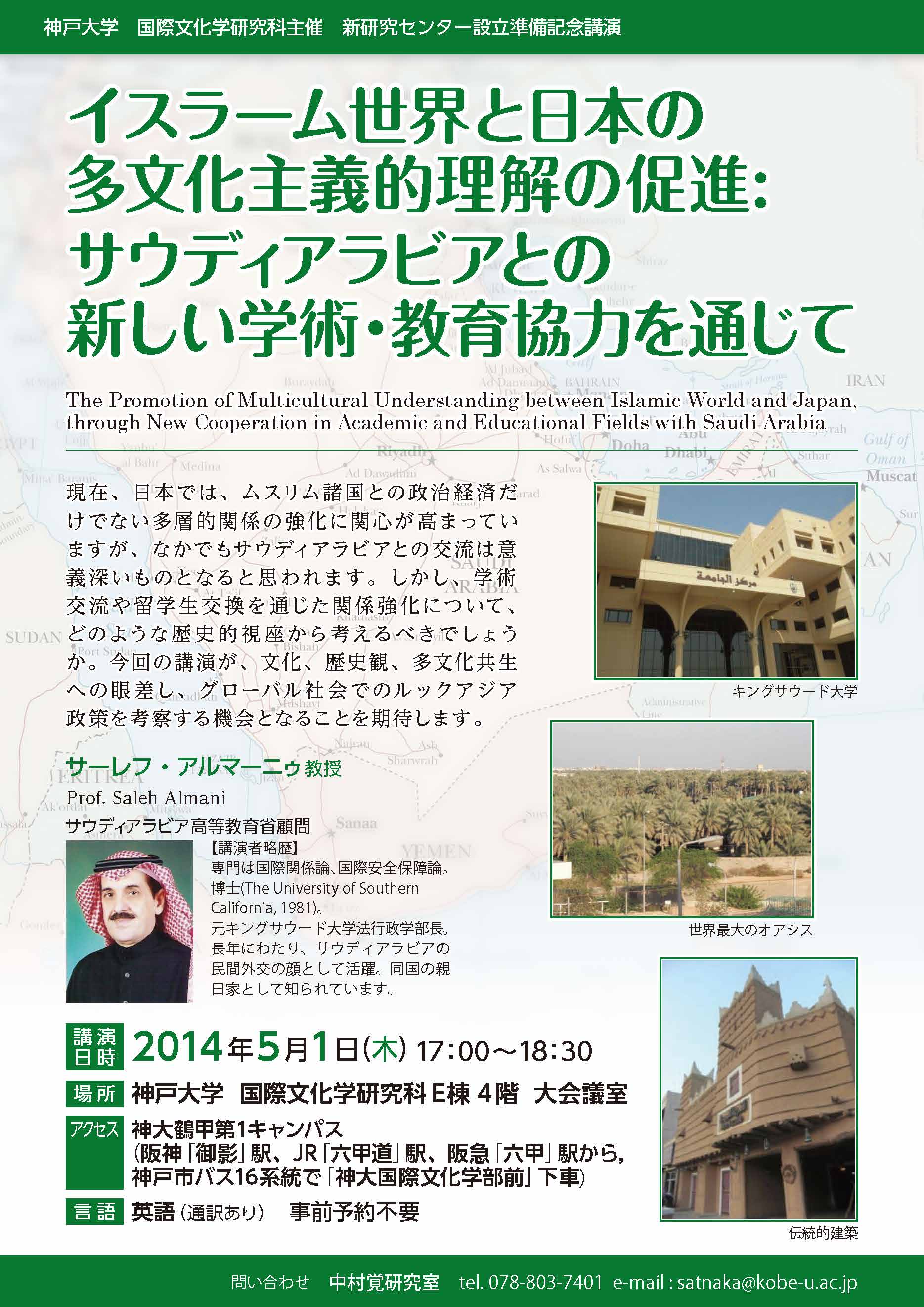 神戸大学大学院国際文化学研究科主催 新研究センター設立準備記念講演 「イスラーム世界と日本の多文化主義的理解の促進:サウディアラビアとの新しい学術・教育協力を通じて」 を以下の通り開催いたします。ふるってご参加ください。
