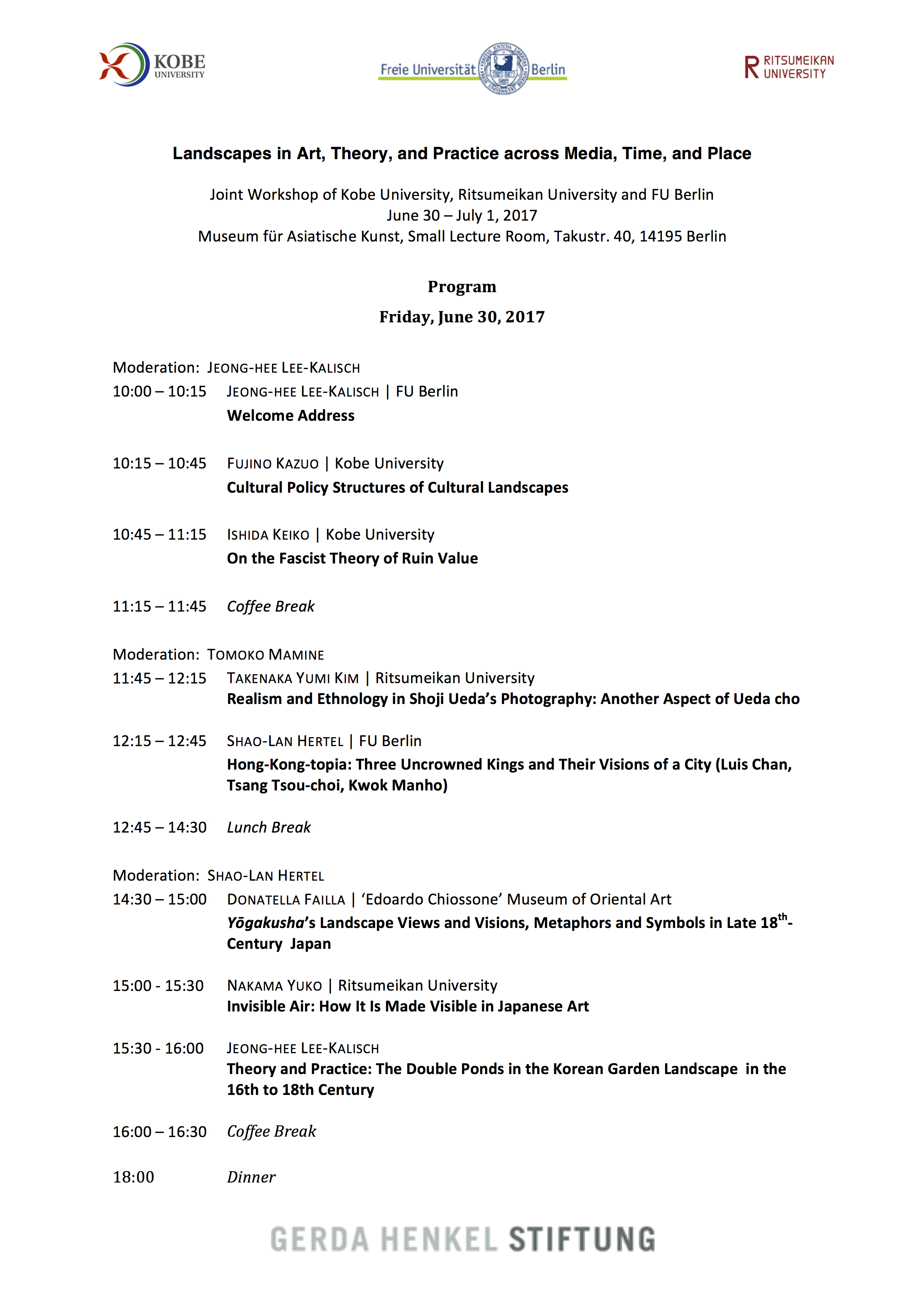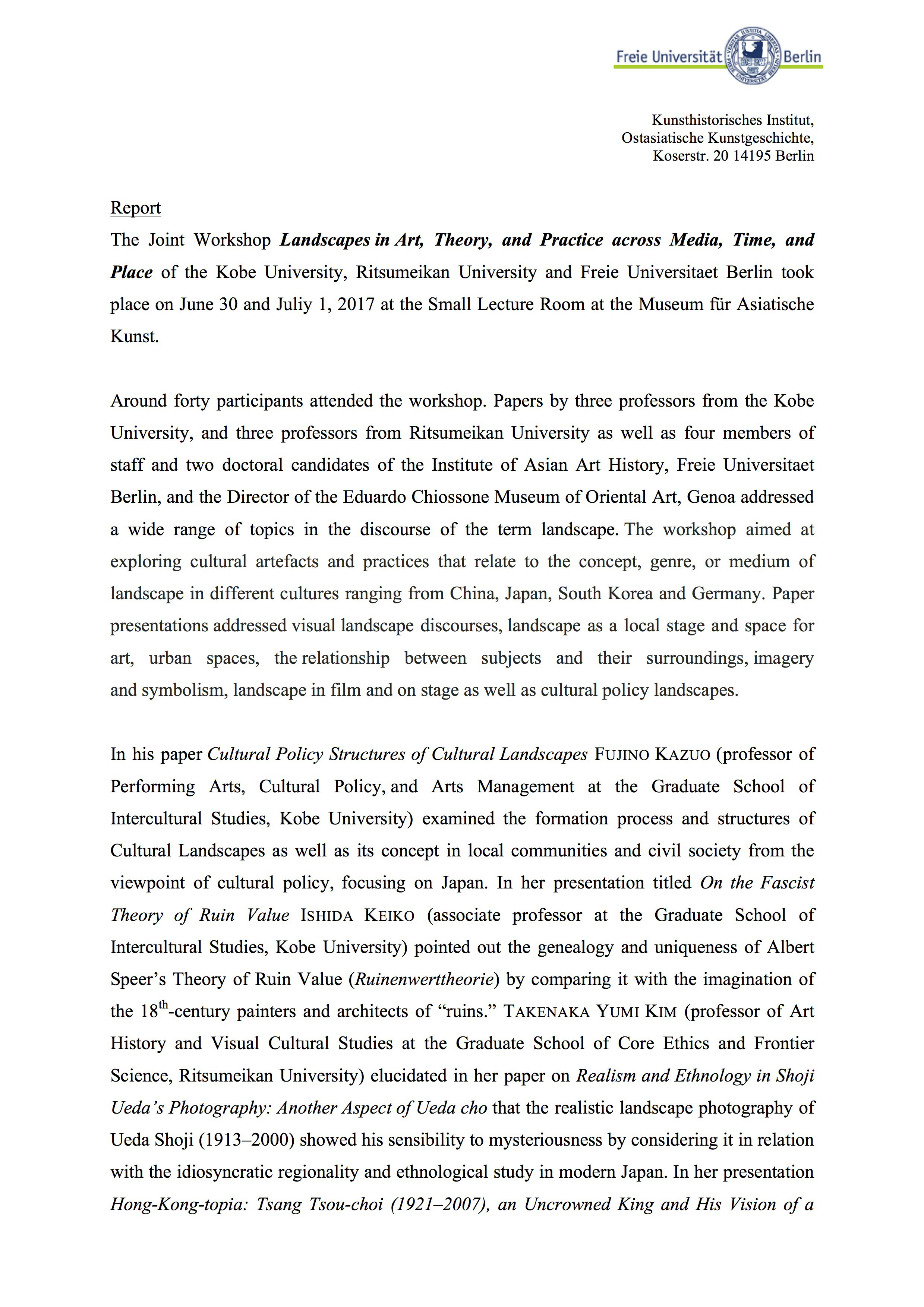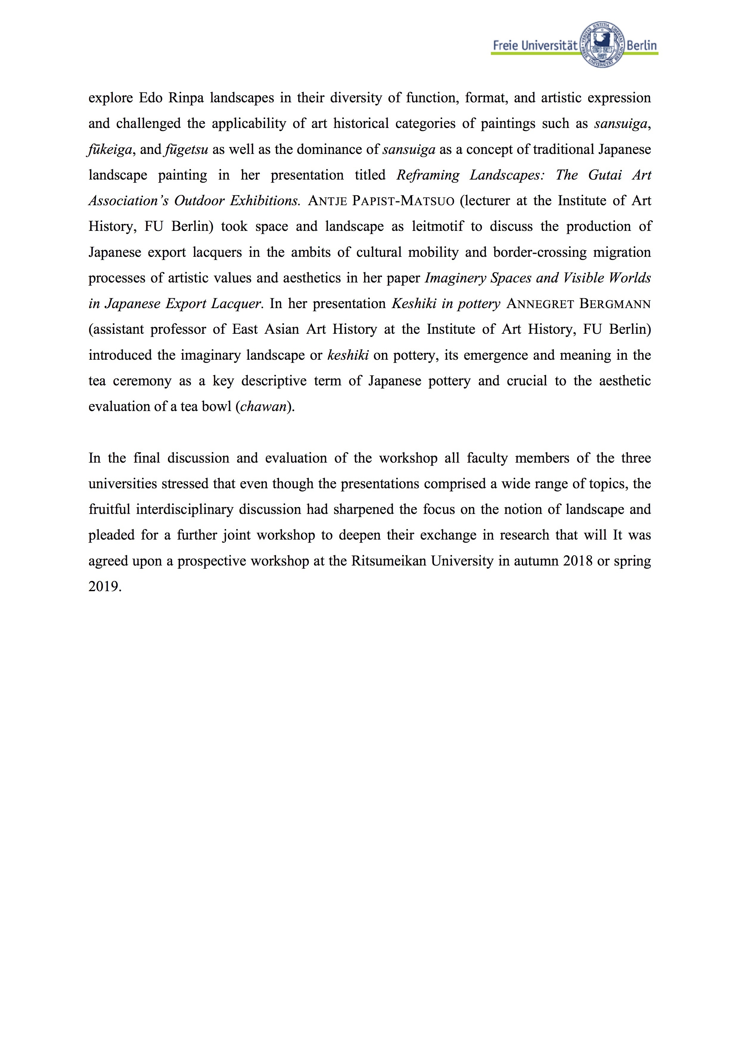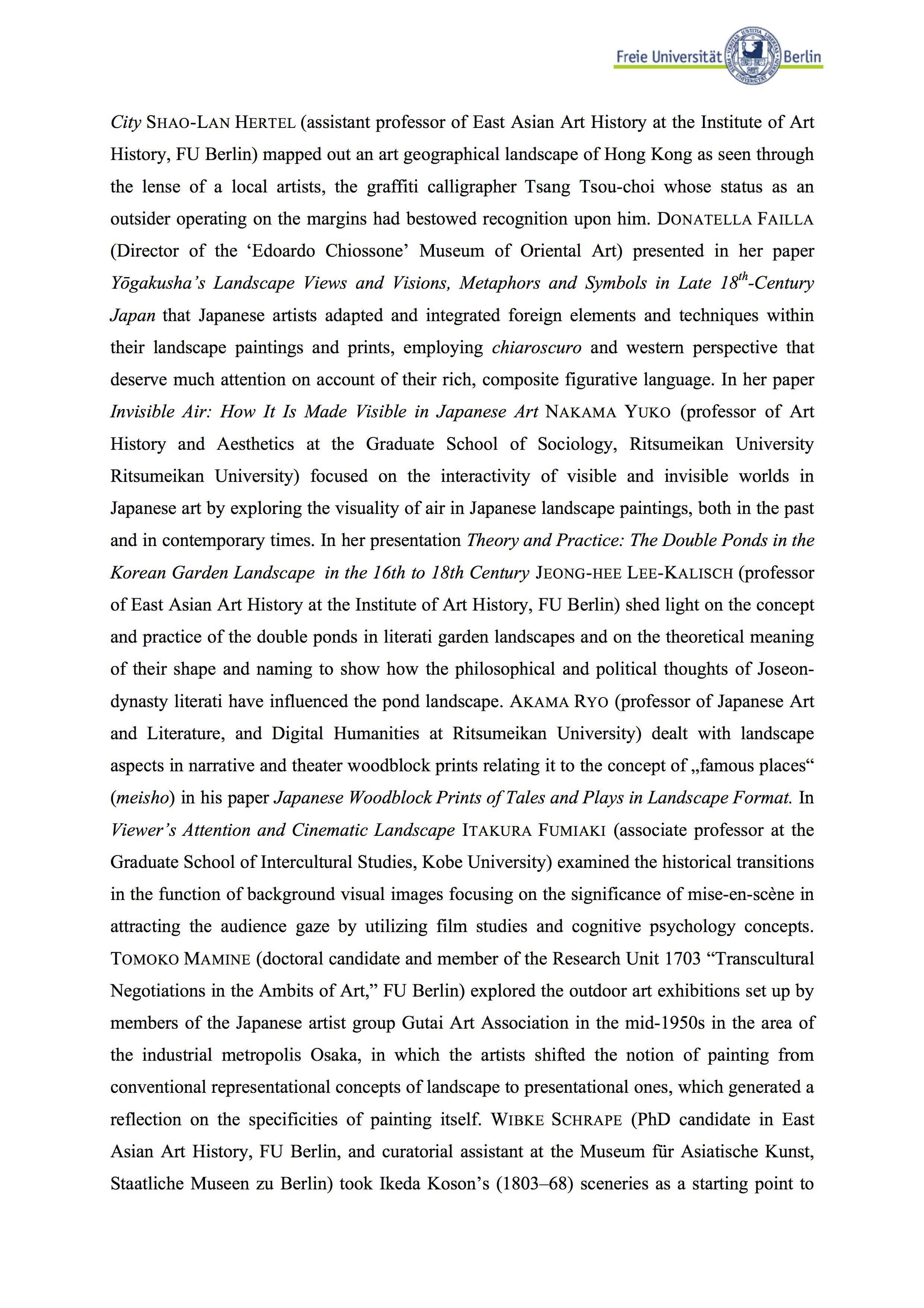 In my paper, I will revisit the outdoor art exhibitions set up by members of the Japanese artist group Gutai Art Association in the mid-1950s in the area of the industrial metropolis Osaka. The challenge of realizing an outdoor art exhibition in the pine grove park in Ashiya City engendered new experimental artistic approaches that ambiguously dealt with the topic of landscape in the context of the so-called “postwar.” On the one hand, the artists grappled with concepts of landscape as established in both Western and Eastern traditions of painting, but also to other scopic visual practices. They shifted the notion of painting from conventional representational concepts of landscape to presentational ones, which generated a reflection on the specificities of painting itself. On the other hand, the artists also responded to infrastructural, industrial and economic developments and urbanization in the Hanshin region, which were particularly fueled by Japan’s reconstruction efforts and the impacts of US-American politics in the aftermath of World War II. Thus, the relation between more narrow art historical notions of landscape and what Tim Ingold claimed to be the original meaning of landscape as the “scaped,” i.e. shaped, land, becomes pertinent. In order to understand these, I will also take into consideration how works by Gutai members related to other cultural and artistic practices that engage with landscape and nature such as architecture, design as well as ikebana.