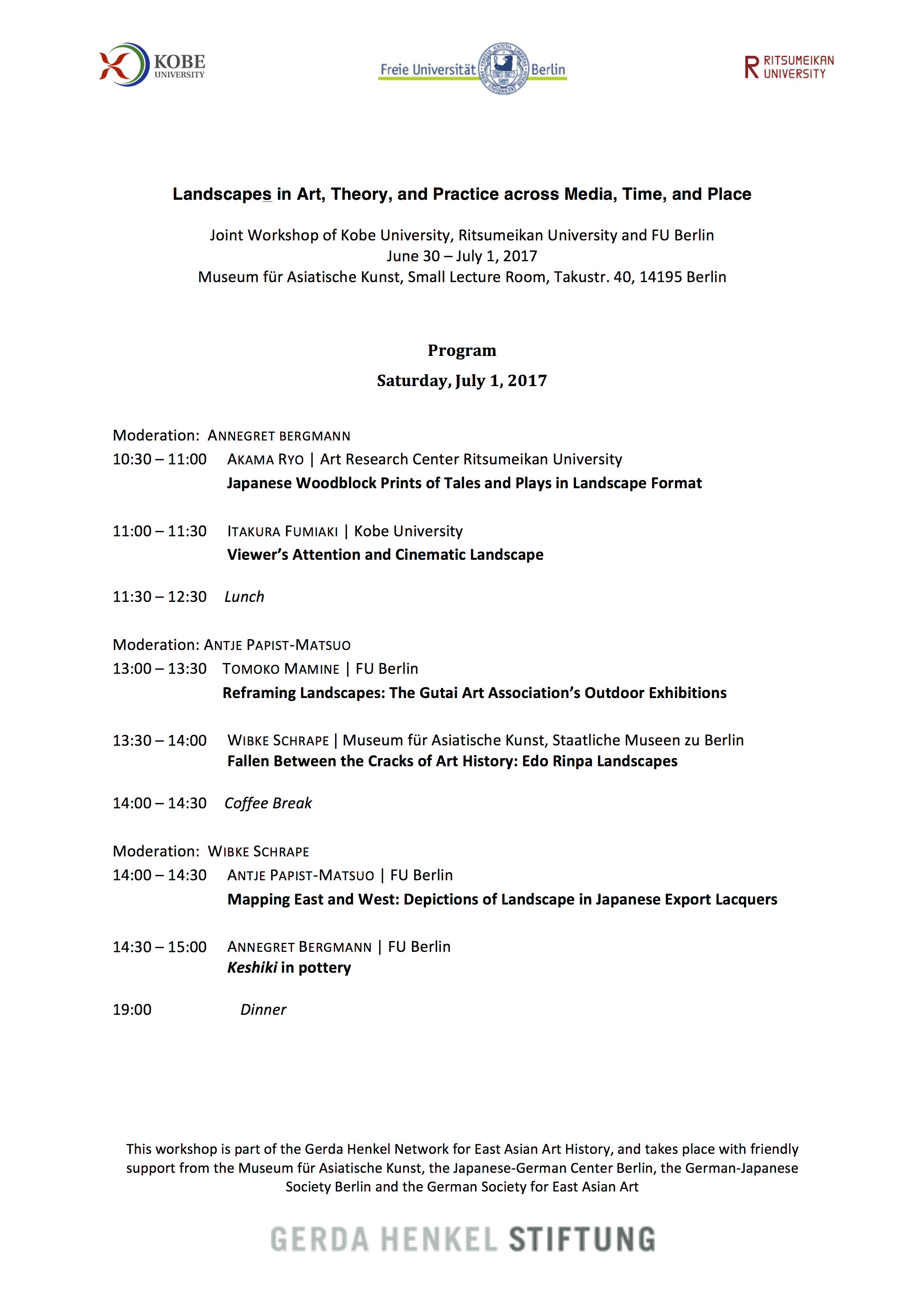 WIBKE SCHRAPE is a PhD candidate in East Asian Art History at Freie Universitaet Berlin, where she also functioned as assistant professor (2008–12). She currently works as curatorial assistant at the Museum für Asiatische Kunst, SMB. Her PhD project on Ikeda Koson (1803–68) and the Order of Images explores artistic and art historical knowledge production in the formation of the Rinpa genealogy. Her publications include „ Performanztheoretische Perspektiven auf japanische Kulturen des Bildes“ (Bunron: Literaturwissenschaftliche Japanforschung, 1/2014: 12–50); „Im Herbst der Tradition: Zu einer Ausstellung von Malerei der späten Rinpa“ (Ostasiatische Zeitschrift, Neue Serie, 33, 2017: 29–43).